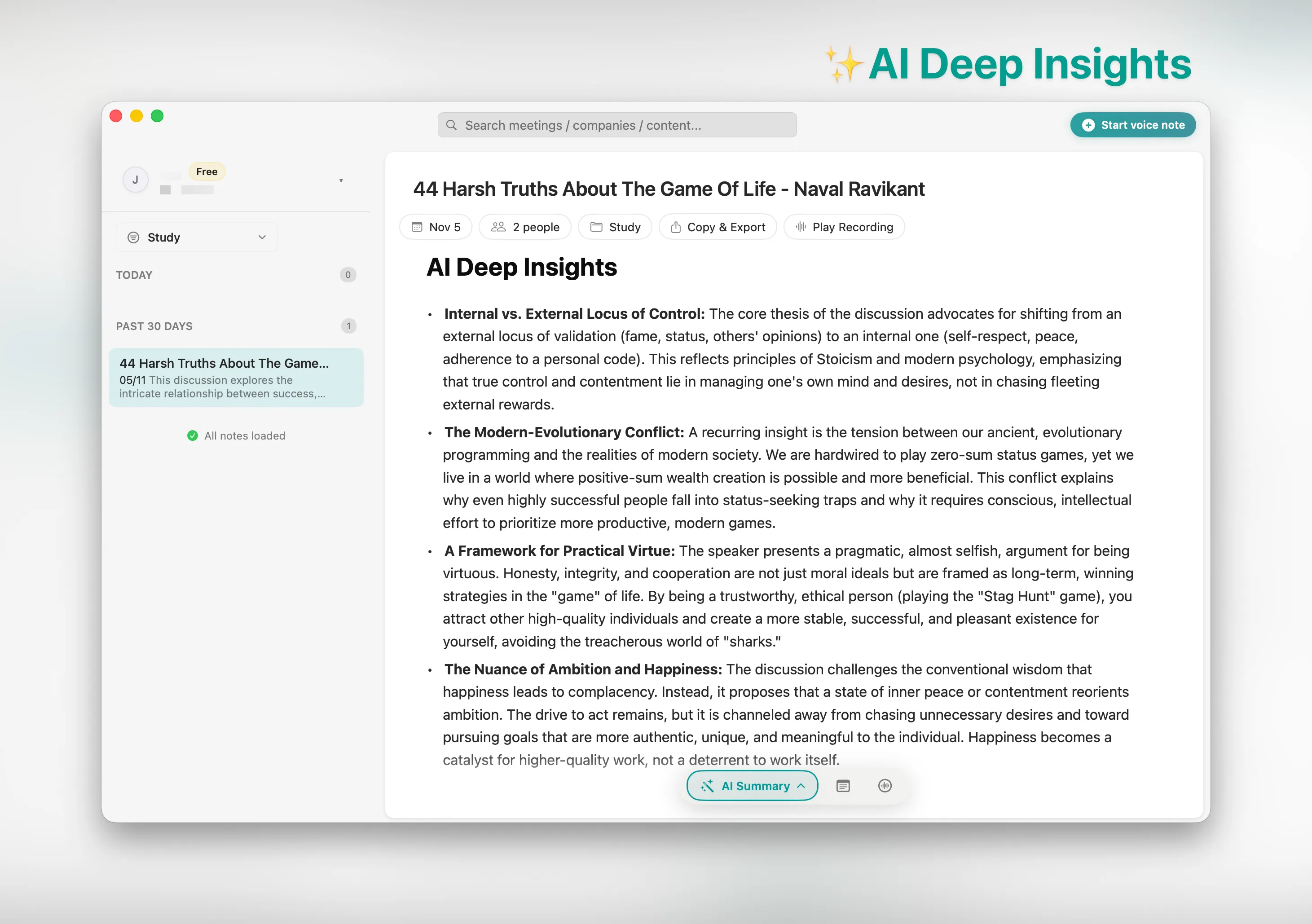 会议中随手记下的想法和灵感,AI 会帮你整理和扩展。你负责思考,我们负责捕捉文字,AI 负责完善内容。